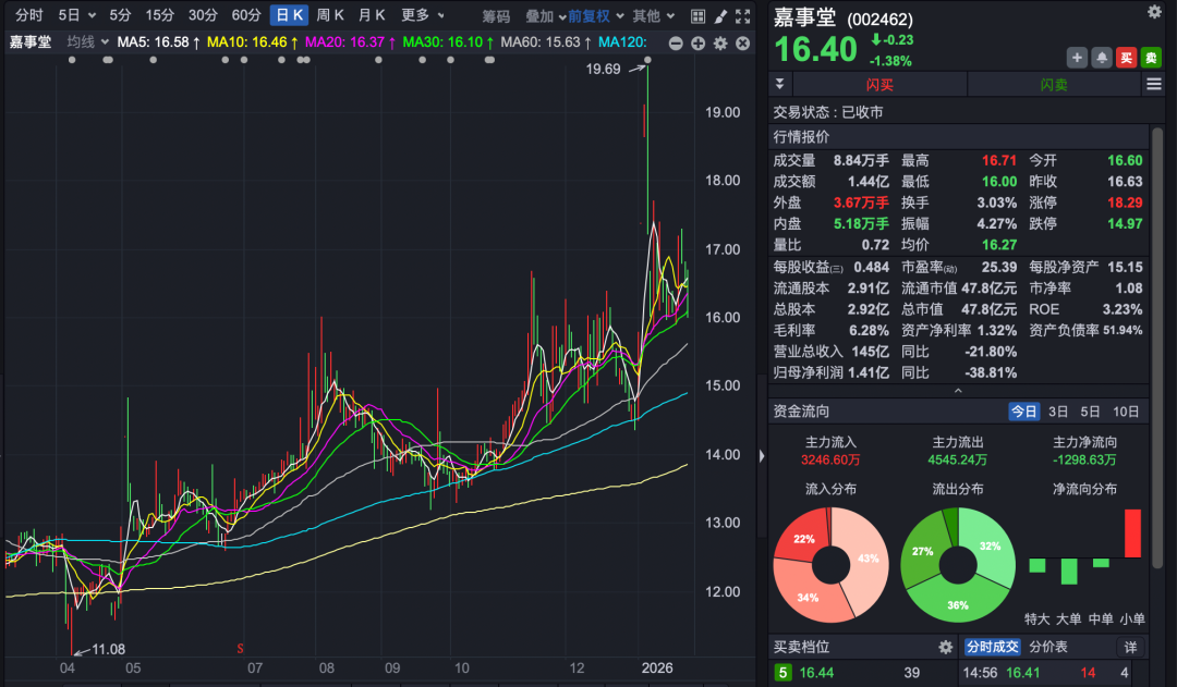 截至1月27日收盘,嘉事堂股价为16.4元/股,总市值47.84亿元。