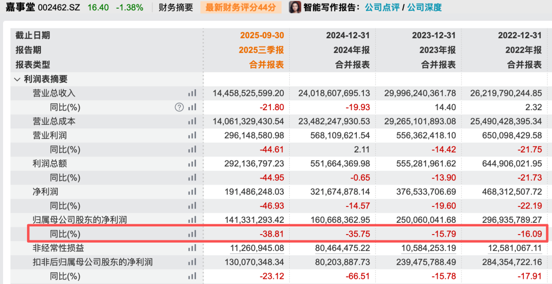 2025年前三季度,嘉事堂营收144.6亿元,同比下滑21.8%;净利润1.413亿元,同比下滑38.81%。2022年度、2023年度、2024年度,嘉事堂净利润分别同比下滑16.09%、15.79%、35.75%。